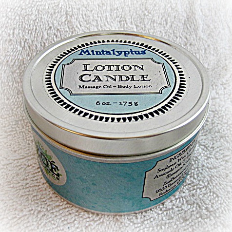 For all skin types. A lotion candle with an all natural cotton wick, plant based oils and essential oils. Light this candle to release the beautiful aroma of the essential oils and enjoy as message oil or moisturizing lotion. 6.8 oz total weight; silver metal tin. Eucalyptus, Rosemary & Mint scent.